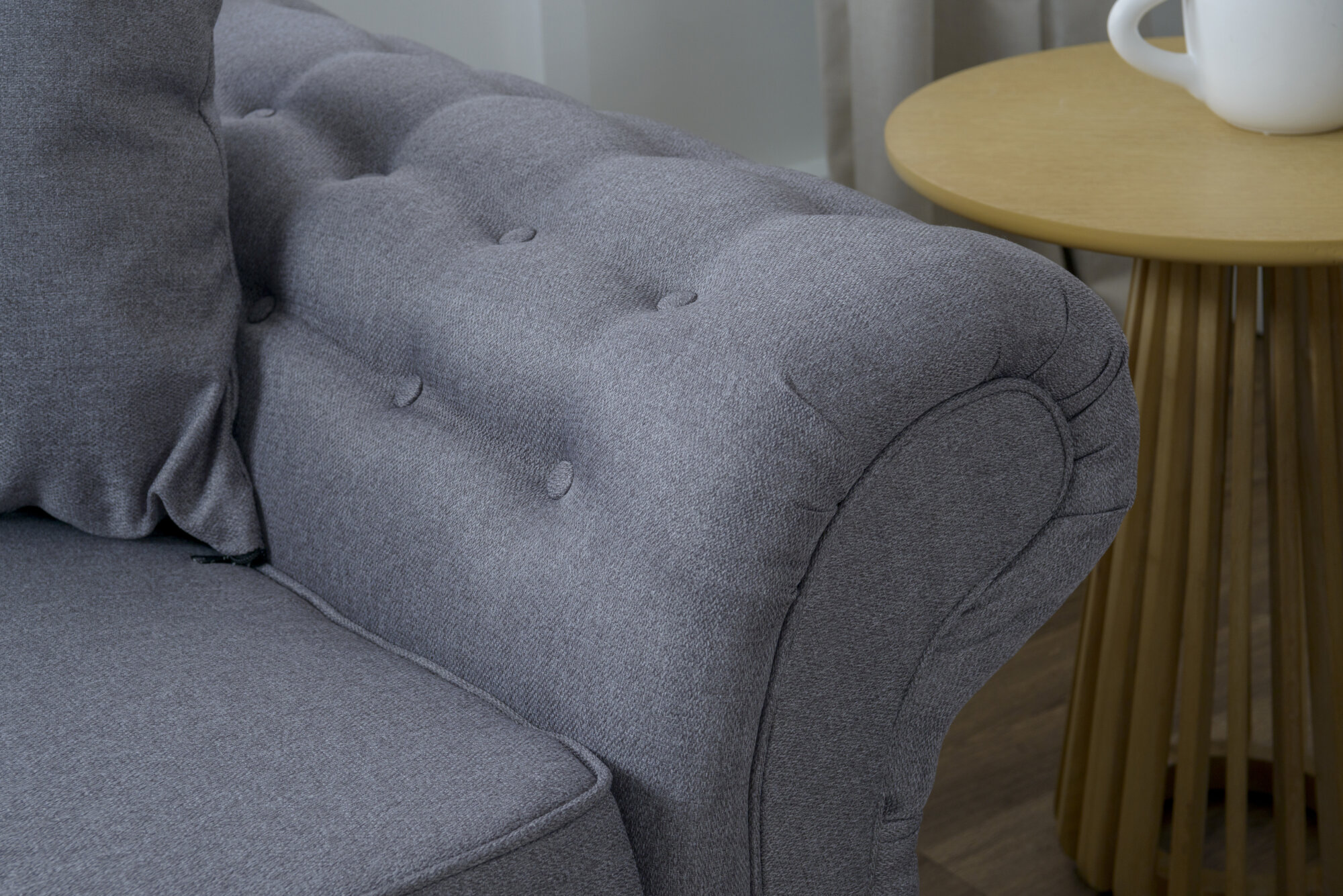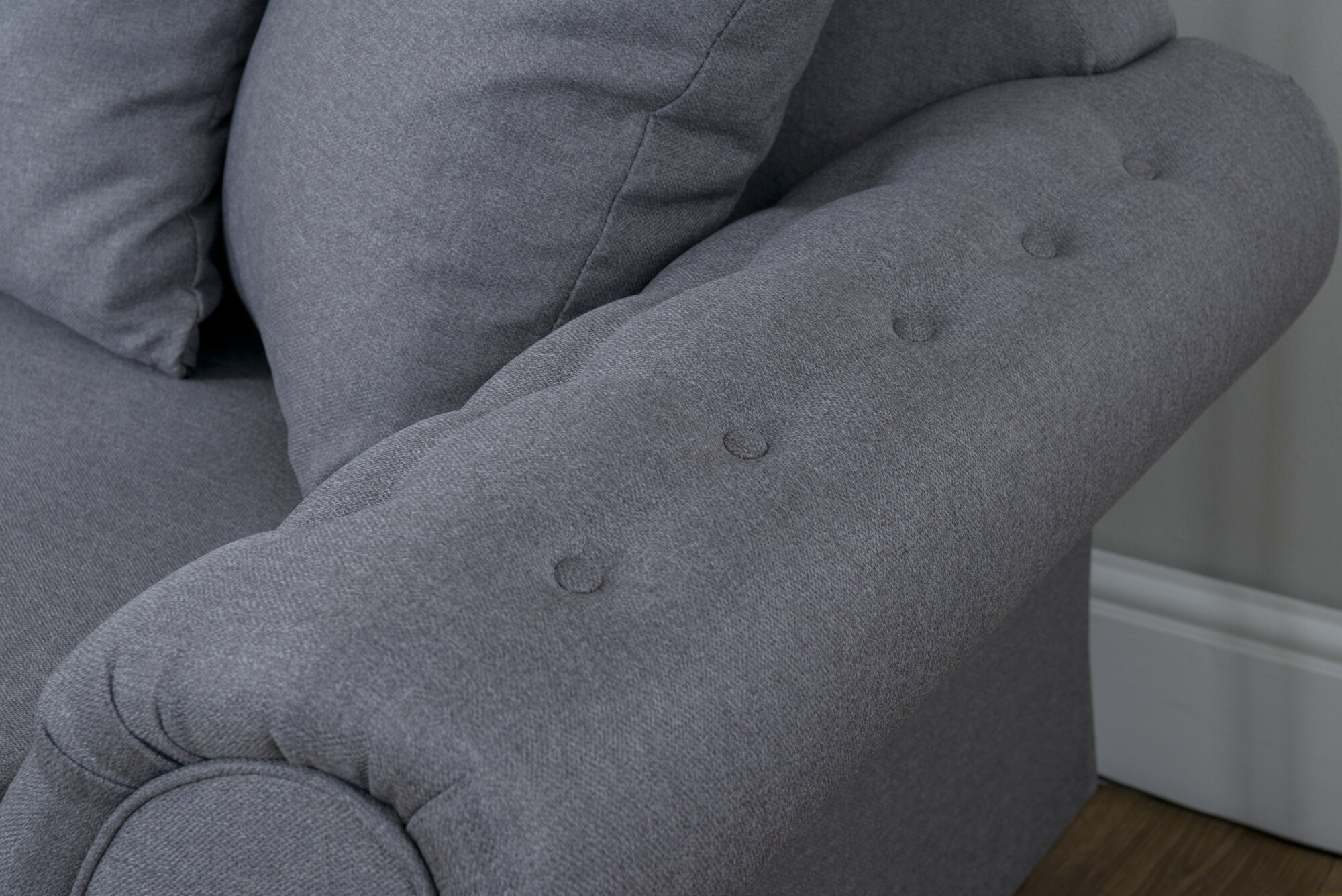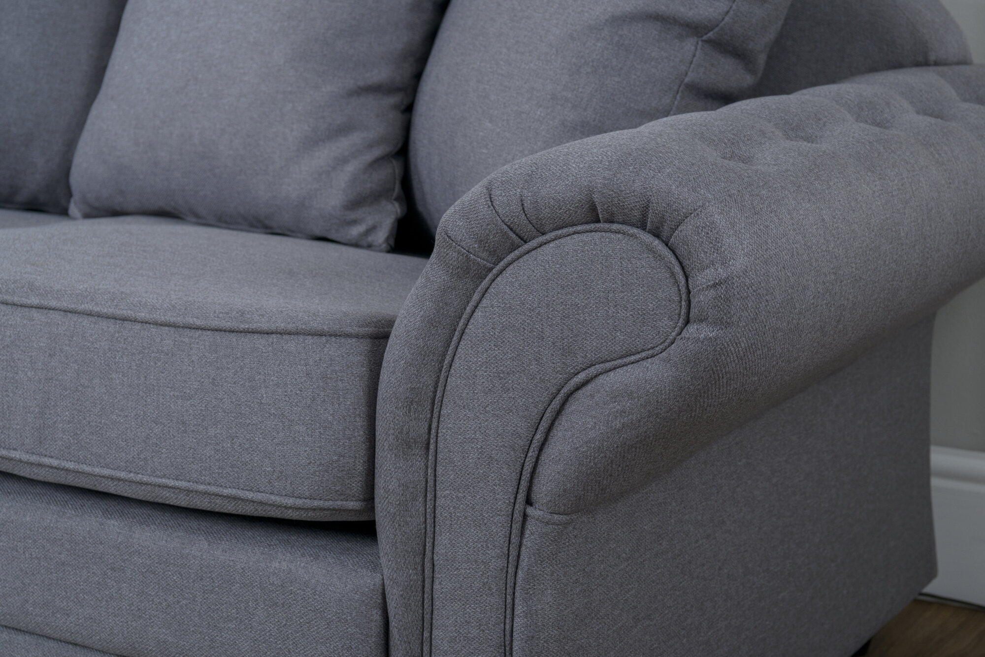 Transform your living room into a haven of luxury and comfort with the stunning Chloe sofa. This opulent 3 & 2 seater masterpiece is upholstered in premium fabric that invites you to sink into its embrace. Feel the softness of the pillow back cushions, perfectly balanced by firmer piped seat cushions for the ultimate relaxation experience. The Chloe’s deep-buttoned scroll arms add a touch of classic elegance, supported by timeless turned feet that make this sofa a showstopper in any setting. Choose from our sophisticated color palette of Charcoal or Light Grey to perfectly match your decor.