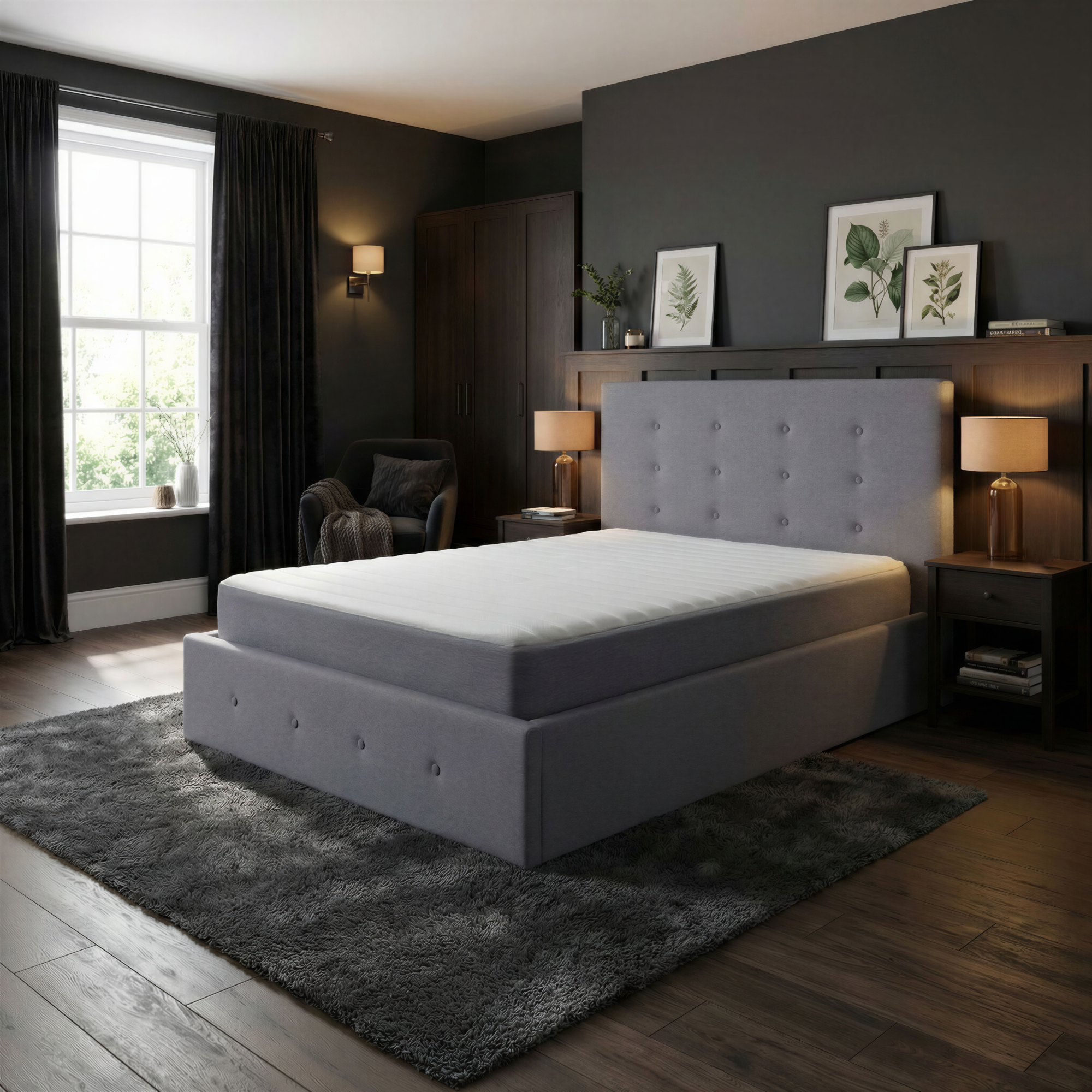 The Diaz Ottoman Bed- Frame offers style and practicality in one, with generous space – saving storage provision and feature buttoned Head and Foot board. Upholstered in a quality Wool Grey fabric