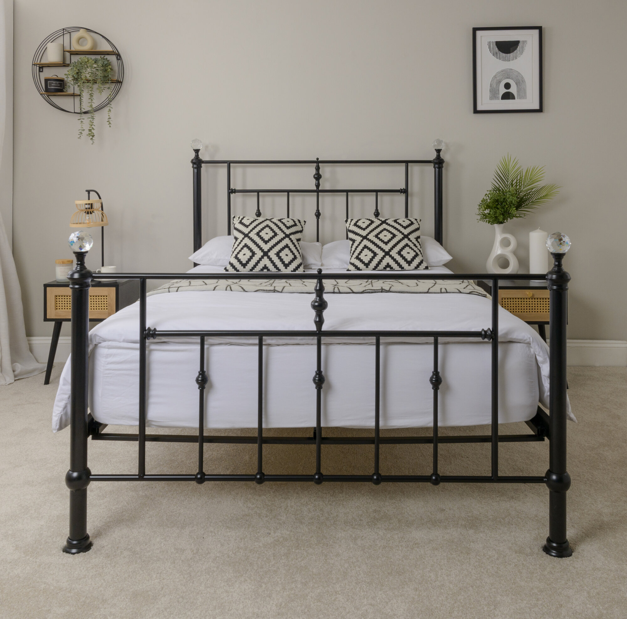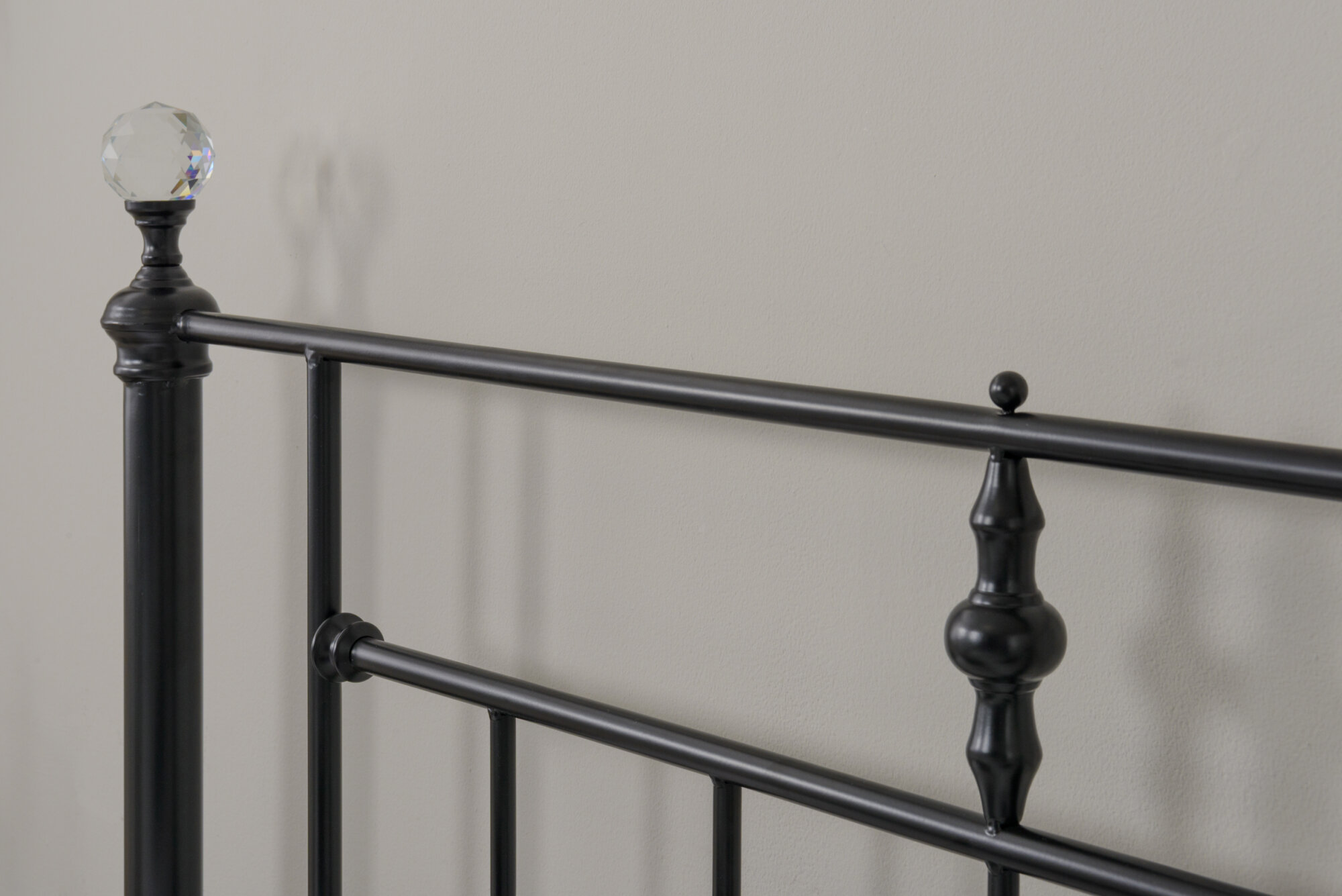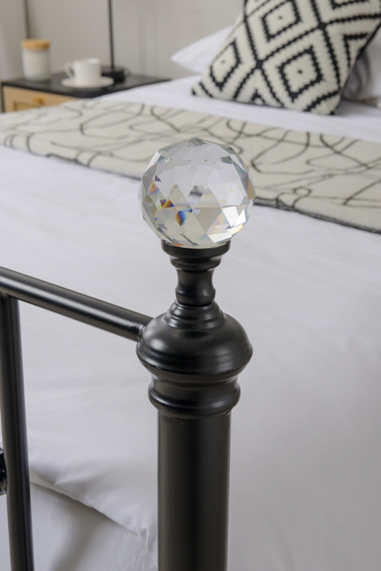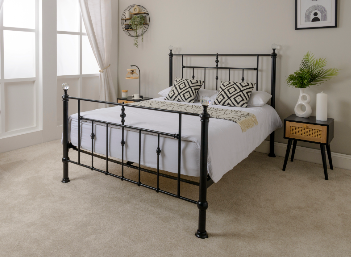The Solar Metal Frame with Crystal Finials – a blend of Victorian-inspired elegance and contemporary style, characterized by ornate, stand out sparkling finials topping the corner posts. finished in a black finish, with sprung slats to increase mattress comfort. This superb metal bed frame will create a great focal point to your bedroom. Available in 4’6 & 5ft