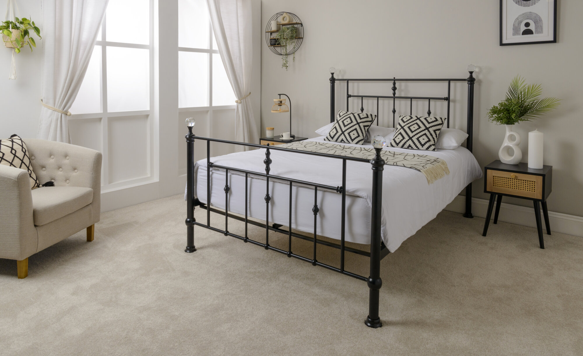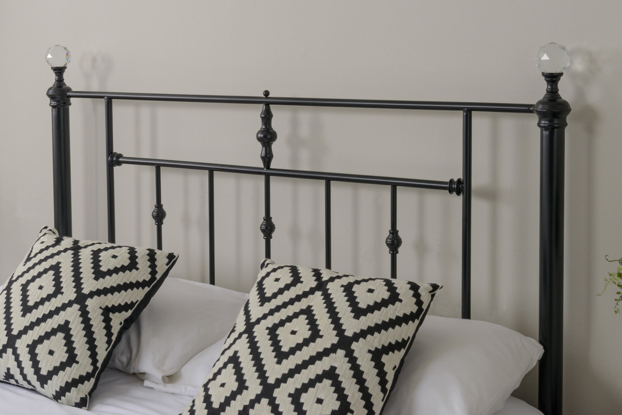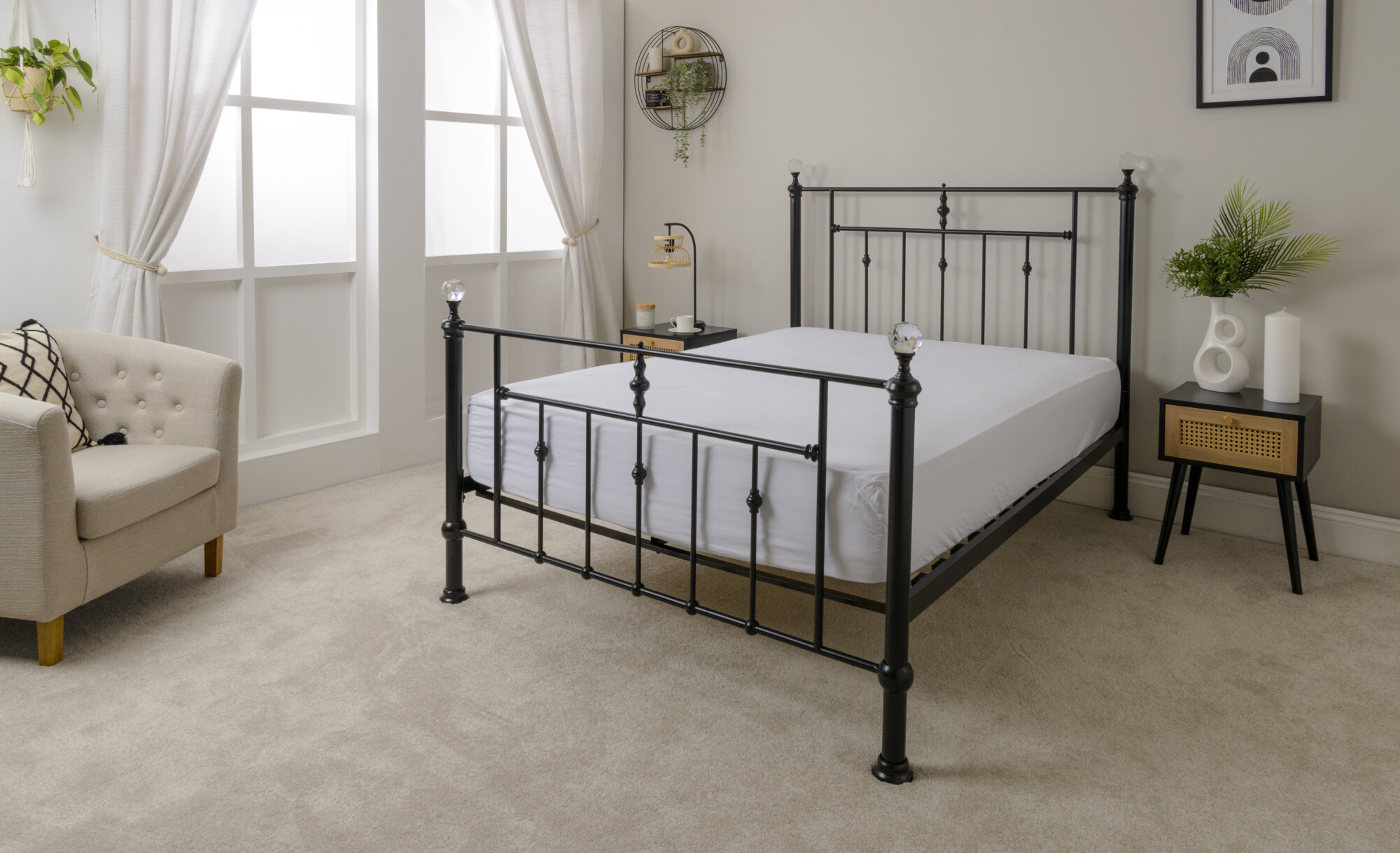 The Solar Metal Frame with Crystal Finials – a blend of Victorian-inspired elegance and contemporary style, characterized by ornate, stand out sparkling finials topping the corner posts. finished in a black finish, with sprung slats to increase mattress comfort. This superb metal bed frame will create a great focal point to your bedroom. Available in 4’6 & 5ft